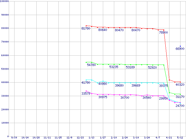 | LGA 775 (FSB 800MHz,L2 2MB×2,Dual Core,EM64T・VT対応)の最安値推移 | | | (2005年9月30日~2006年5月12日) |