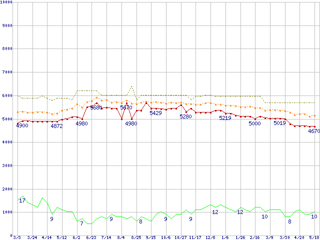 ※このグラフは過去のデータも税率5%相当に調整した税込み相当額のグラフです。 税率変更や、総額表示方式導入(2004年4月)の影響は除いています。 | | | ●凡例 | 最安値 (点線部は販売店未確認 または未調査) | 平均値 | 最高値 | ショップ数 |