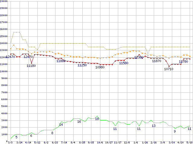 ※このグラフは過去のデータも税率5%相当に調整した税込み相当額のグラフです。 税率変更や、総額表示方式導入(2004年4月)の影響は除いています。 | | | ●凡例 | 最安値 (点線部は販売店未確認 または未調査) | 平均値 | 最高値 | ショップ数 |