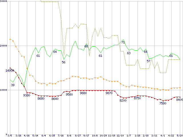 ※このグラフは過去のデータも税率5%相当に調整した税込み相当額のグラフです。 税率変更や、総額表示方式導入(2004年4月)の影響は除いています。 | | | ●凡例 | 最安値 (点線部は販売店未確認 または未調査) | 平均値 | 最高値 | ショップ数 |