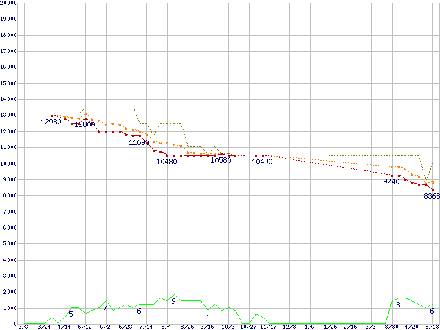 ※このグラフは過去のデータも税率5%相当に調整した税込み相当額のグラフです。 税率変更や、総額表示方式導入(2004年4月)の影響は除いています。 | | | ●凡例 | 最安値 (点線部は販売店未確認 または未調査) | 平均値 | 最高値 | ショップ数 |