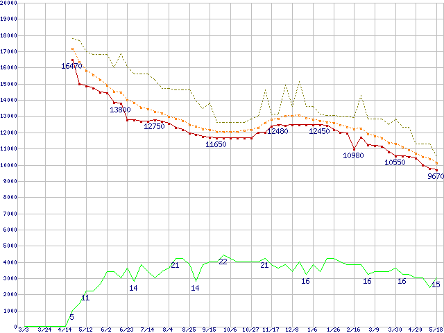 ※このグラフは過去のデータも税率5%相当に調整した税込み相当額のグラフです。 税率変更や、総額表示方式導入(2004年4月)の影響は除いています。 | | | ●凡例 | 最安値 (点線部は販売店未確認 または未調査) | 平均値 | 最高値 | ショップ数 |