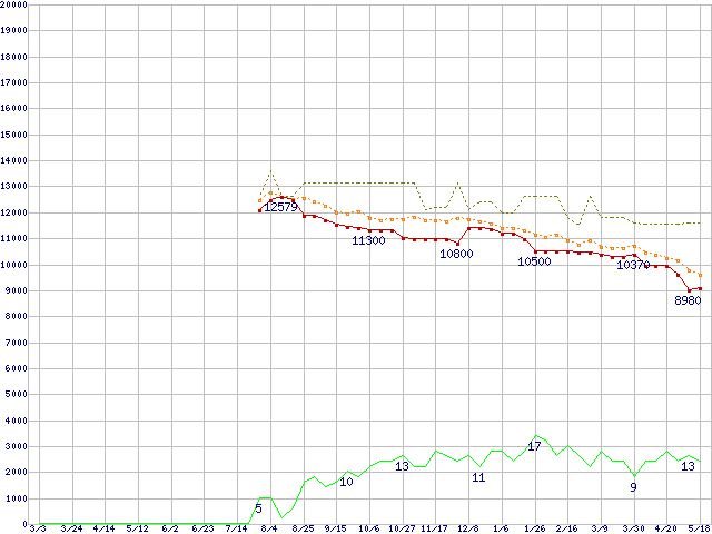 ※このグラフは過去のデータも税率5%相当に調整した税込み相当額のグラフです。 税率変更や、総額表示方式導入(2004年4月)の影響は除いています。 | | | ●凡例 | 最安値 (点線部は販売店未確認 または未調査) | 平均値 | 最高値 | ショップ数 |