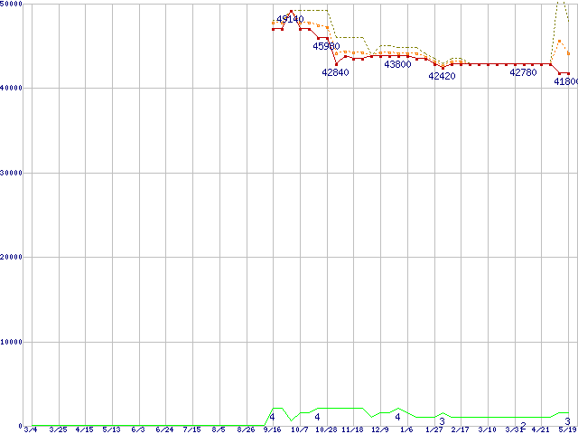 ※このグラフは過去のデータも税率5%相当に調整した税込み相当額のグラフです。 税率変更や、総額表示方式導入(2004年4月)の影響は除いています。 | | | ●凡例 | 最安値 (点線部は販売店未確認 または未調査) | 平均値 | 最高値 | ショップ数 |