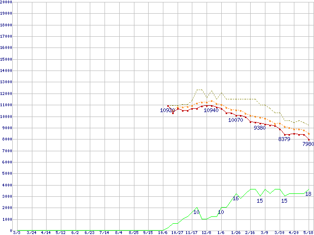 ※このグラフは過去のデータも税率5%相当に調整した税込み相当額のグラフです。 税率変更や、総額表示方式導入(2004年4月)の影響は除いています。 | | | ●凡例 | 最安値 (点線部は販売店未確認 または未調査) | 平均値 | 最高値 | ショップ数 |