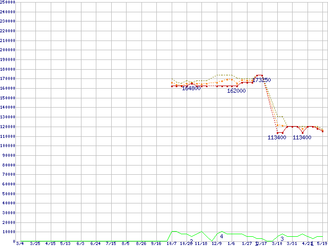 ※このグラフは過去のデータも税率5%相当に調整した税込み相当額のグラフです。 税率変更や、総額表示方式導入(2004年4月)の影響は除いています。 | | | ●凡例 | 最安値 (点線部は販売店未確認 または未調査) | 平均値 | 最高値 | ショップ数 |