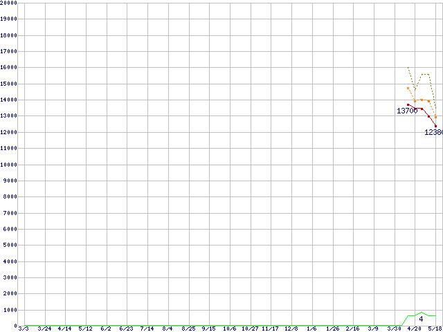 ※このグラフは過去のデータも税率5%相当に調整した税込み相当額のグラフです。 税率変更や、総額表示方式導入(2004年4月)の影響は除いています。 | | | ●凡例 | 最安値 (点線部は販売店未確認 または未調査) | 平均値 | 最高値 | ショップ数 |