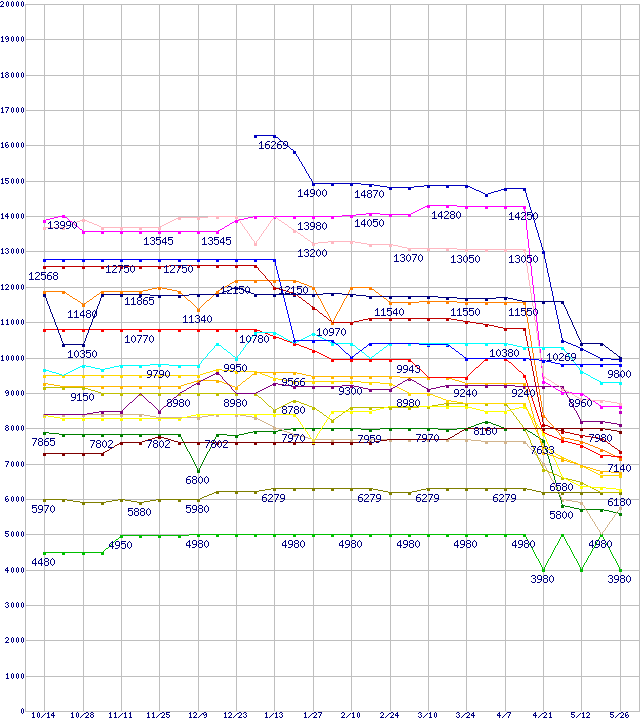 CPU主要製品(最安値1万円~2万円未満)の最安値推移