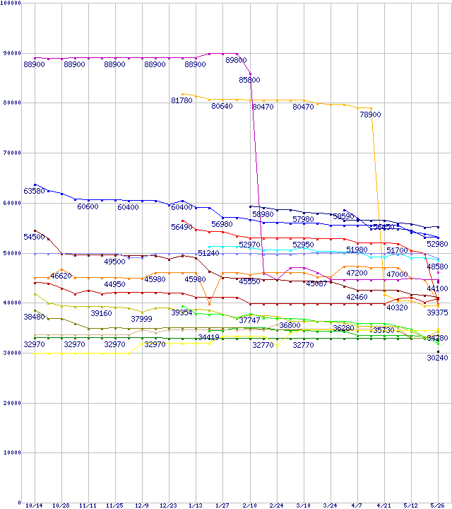 | CPU主要製品(最安値3万円~6万円未満)の最安値推移 | | | (2005年10月14日~2006年5月26日) |