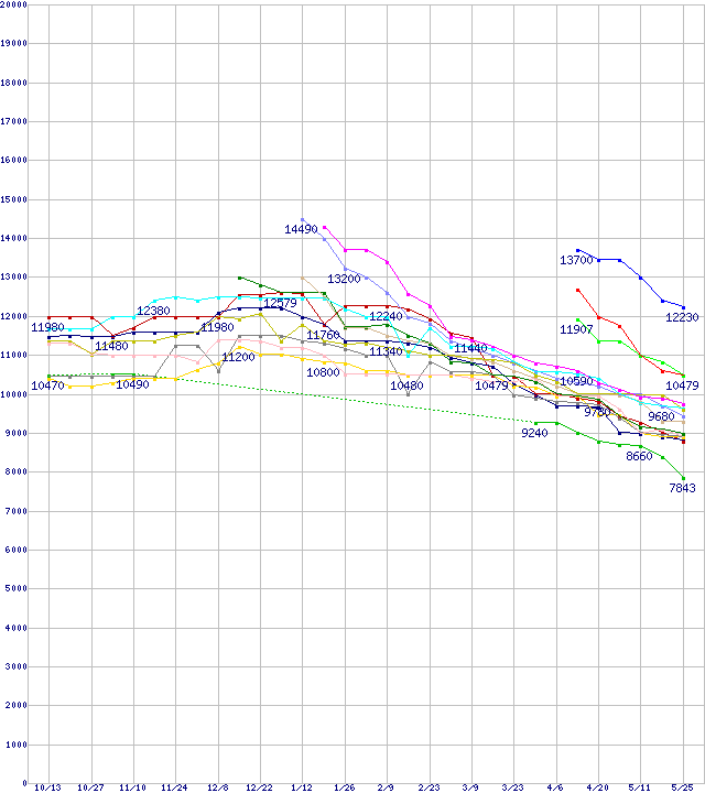 | HDD 250~300GB未満の最安値推移 | | | (2005年10月13日~2006年5月25日) |