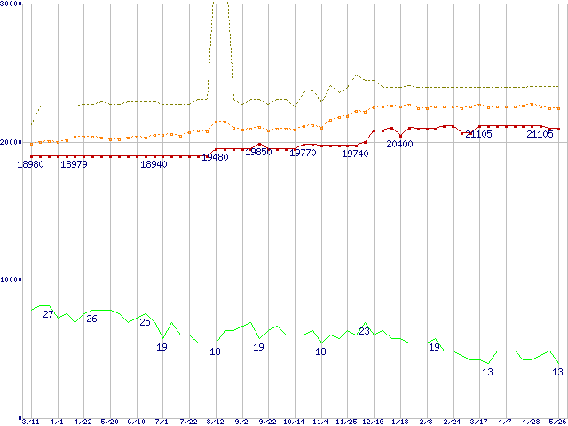 ※このグラフは過去のデータも税率5%相当に調整した税込み相当額のグラフです。 税率変更や、総額表示方式導入(2004年4月)の影響は除いています。 | | | ●凡例 | 最安値 (点線部は販売店未確認 または未調査) | 平均値 | 最高値 | ショップ数 |
