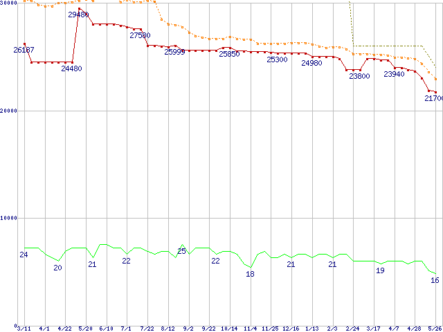 | Athlon 64 3500+ (2.2GHz,L2 512KB,Socket 939)の価格推移 | | | (2005年3月11日~2006年5月26日) |
