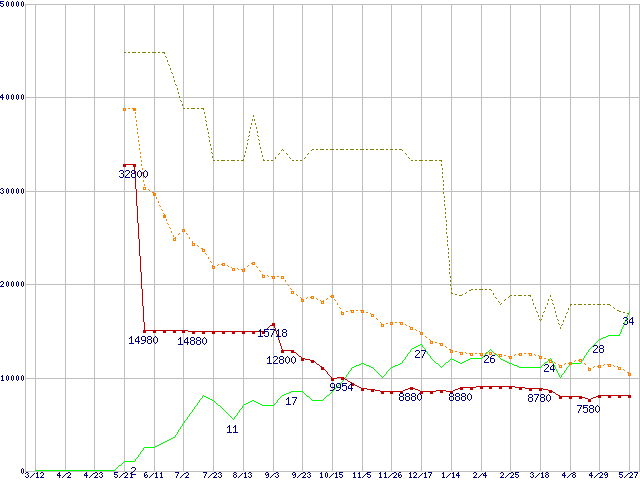 ※このグラフは過去のデータも税率5%相当に調整した税込み相当額のグラフです。 税率変更や、総額表示方式導入(2004年4月)の影響は除いています。 | | | ●凡例 | 最安値 (点線部は販売店未確認 または未調査) | 平均値 | 最高値 | ショップ数 |