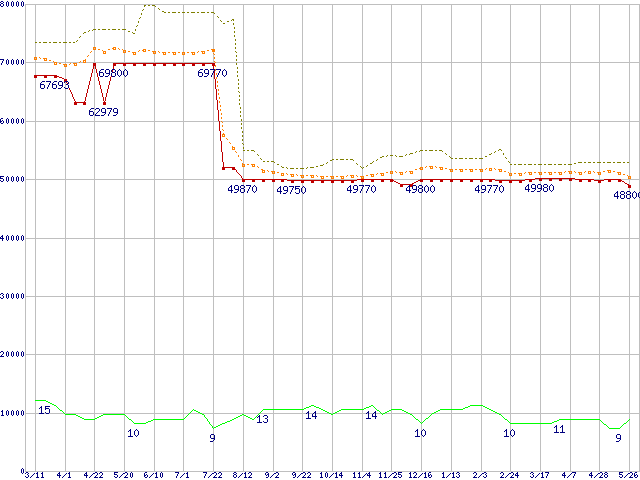 ※このグラフは過去のデータも税率5%相当に調整した税込み相当額のグラフです。 税率変更や、総額表示方式導入(2004年4月)の影響は除いています。 | | | ●凡例 | 最安値 (点線部は販売店未確認 または未調査) | 平均値 | 最高値 | ショップ数 |