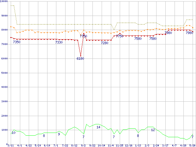 ※このグラフは過去のデータも税率5%相当に調整した税込み相当額のグラフです。 税率変更や、総額表示方式導入(2004年4月)の影響は除いています。 | | | ●凡例 | 最安値 (点線部は販売店未確認 または未調査) | 平均値 | 最高値 | ショップ数 |