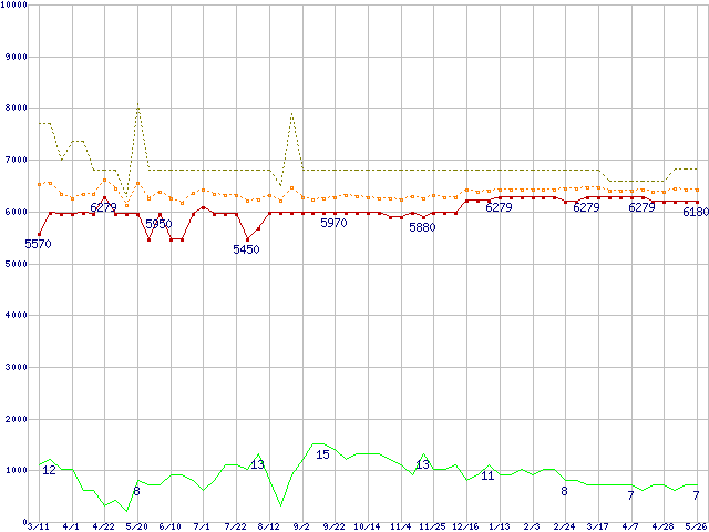 ※このグラフは過去のデータも税率5%相当に調整した税込み相当額のグラフです。 税率変更や、総額表示方式導入(2004年4月)の影響は除いています。 | | | ●凡例 | 最安値 (点線部は販売店未確認 または未調査) | 平均値 | 最高値 | ショップ数 |
