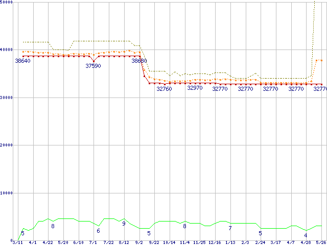 ※このグラフは過去のデータも税率5%相当に調整した税込み相当額のグラフです。 税率変更や、総額表示方式導入(2004年4月)の影響は除いています。 | | | ●凡例 | 最安値 (点線部は販売店未確認 または未調査) | 平均値 | 最高値 | ショップ数 |