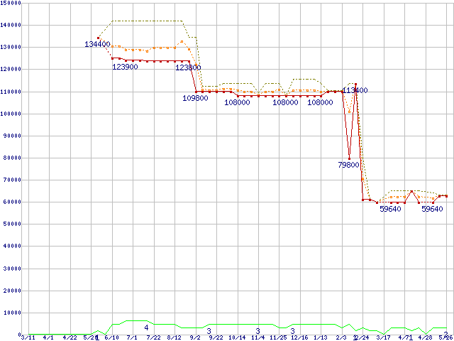 ※このグラフは過去のデータも税率5%相当に調整した税込み相当額のグラフです。 税率変更や、総額表示方式導入(2004年4月)の影響は除いています。 | | | ●凡例 | 最安値 (点線部は販売店未確認 または未調査) | 平均値 | 最高値 | ショップ数 |