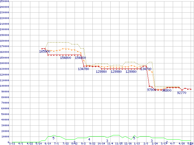 ※このグラフは過去のデータも税率5%相当に調整した税込み相当額のグラフです。 税率変更や、総額表示方式導入(2004年4月)の影響は除いています。 | | | ●凡例 | 最安値 (点線部は販売店未確認 または未調査) | 平均値 | 最高値 | ショップ数 |