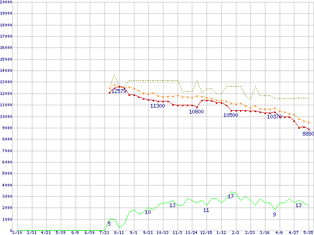 ※このグラフは過去のデータも税率5%相当に調整した税込み相当額のグラフです。 税率変更や、総額表示方式導入(2004年4月)の影響は除いています。 | | | ●凡例 | 最安値 (点線部は販売店未確認 または未調査) | 平均値 | 最高値 | ショップ数 |
