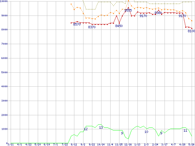 ※このグラフは過去のデータも税率5%相当に調整した税込み相当額のグラフです。 税率変更や、総額表示方式導入(2004年4月)の影響は除いています。 | | | ●凡例 | 最安値 (点線部は販売店未確認 または未調査) | 平均値 | 最高値 | ショップ数 |