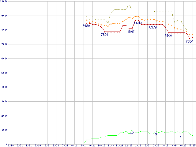 ※このグラフは過去のデータも税率5%相当に調整した税込み相当額のグラフです。 税率変更や、総額表示方式導入(2004年4月)の影響は除いています。 | | | ●凡例 | 最安値 (点線部は販売店未確認 または未調査) | 平均値 | 最高値 | ショップ数 |