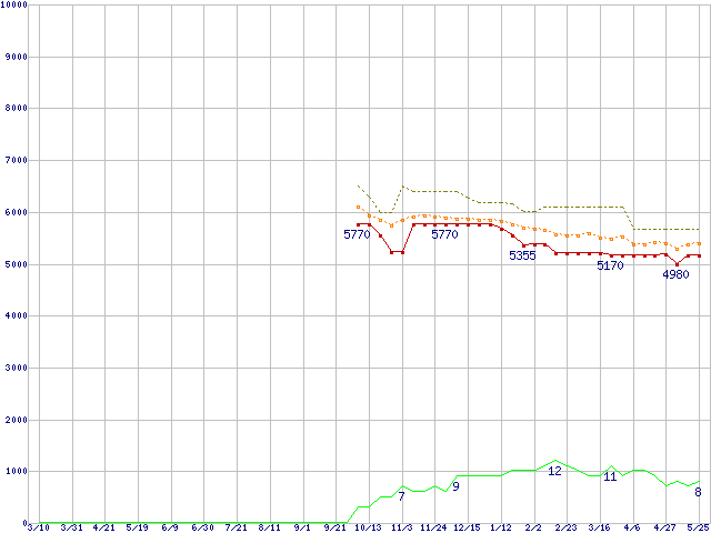 ※このグラフは過去のデータも税率5%相当に調整した税込み相当額のグラフです。 税率変更や、総額表示方式導入(2004年4月)の影響は除いています。 | | | ●凡例 | 最安値 (点線部は販売店未確認 または未調査) | 平均値 | 最高値 | ショップ数 |