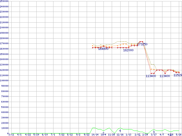 ※このグラフは過去のデータも税率5%相当に調整した税込み相当額のグラフです。 税率変更や、総額表示方式導入(2004年4月)の影響は除いています。 | | | ●凡例 | 最安値 (点線部は販売店未確認 または未調査) | 平均値 | 最高値 | ショップ数 |