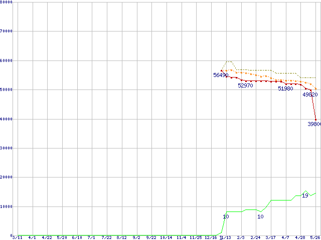 ※このグラフは過去のデータも税率5%相当に調整した税込み相当額のグラフです。 税率変更や、総額表示方式導入(2004年4月)の影響は除いています。 | | | ●凡例 | 最安値 (点線部は販売店未確認 または未調査) | 平均値 | 最高値 | ショップ数 |