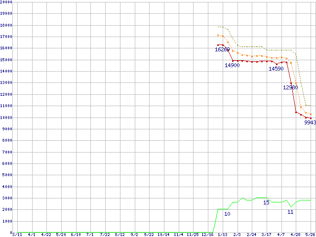 ※このグラフは過去のデータも税率5%相当に調整した税込み相当額のグラフです。 税率変更や、総額表示方式導入(2004年4月)の影響は除いています。 | | | ●凡例 | 最安値 (点線部は販売店未確認 または未調査) | 平均値 | 最高値 | ショップ数 |