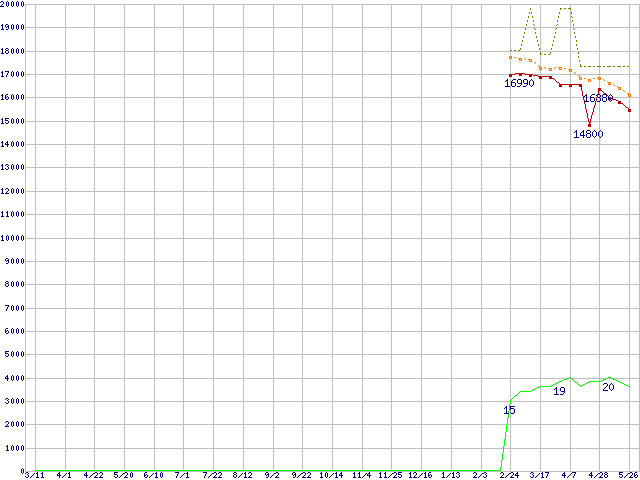 ※このグラフは過去のデータも税率5%相当に調整した税込み相当額のグラフです。 税率変更や、総額表示方式導入(2004年4月)の影響は除いています。 | | | ●凡例 | 最安値 (点線部は販売店未確認 または未調査) | 平均値 | 最高値 | ショップ数 |