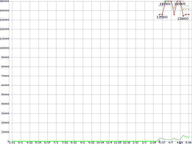 ※このグラフは過去のデータも税率5%相当に調整した税込み相当額のグラフです。 税率変更や、総額表示方式導入(2004年4月)の影響は除いています。 | | | ●凡例 | 最安値 (点線部は販売店未確認 または未調査) | 平均値 | 最高値 | ショップ数 |