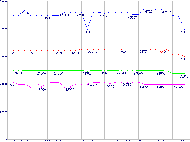 | LGA 775 (FSB 800MHz,L2 2MB,Hyper-Threading,EM64T対応)の最安値推移 | | | (2005年10月14日~2006年5月26日) |