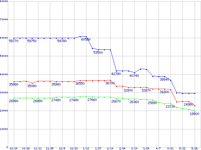 | LGA 775 (FSB 800MHz,L2 1MB×2,Dual Core,EM64T対応)の最安値推移 | | | (2005年10月14日~2006年5月26日) |