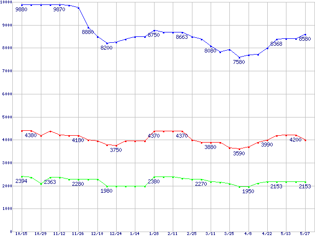 PC2-6400(DDR2-800) DDR2 SDRAM DIMMの最安値推移