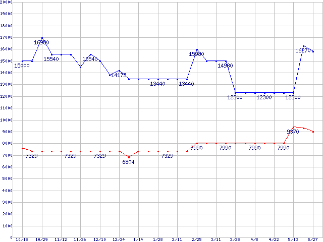 | PC3200(DDR400) DDR SDRAM DIMM ECC対応 Registeredタイプの最安値推移 | | | (2005年10月15日~2006年5月27日) |