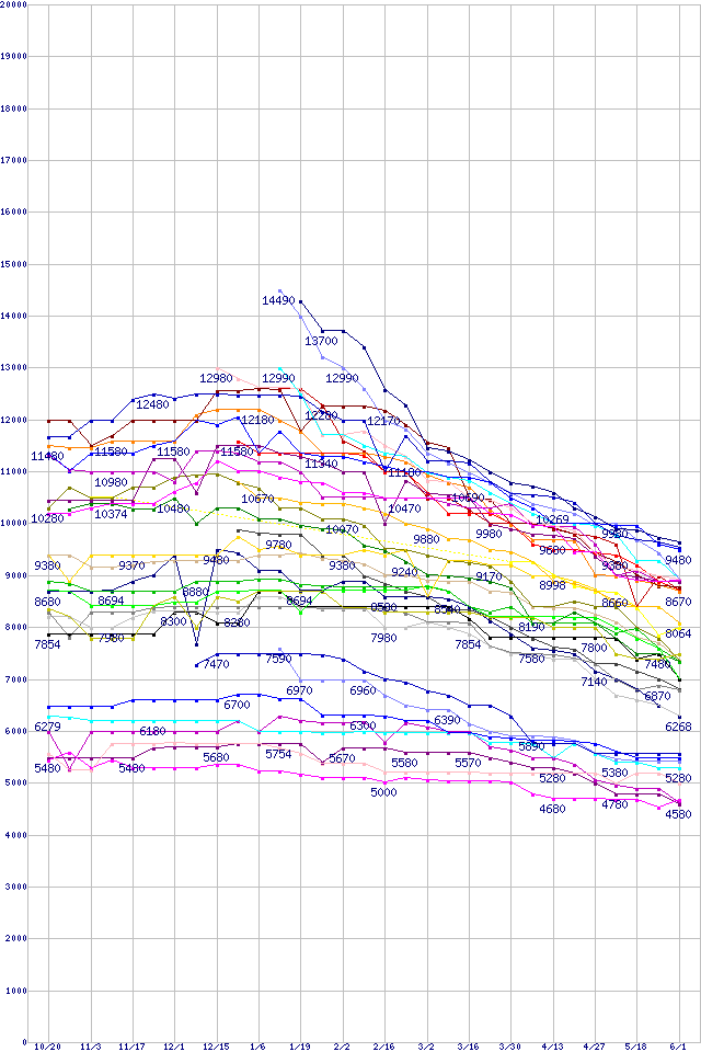 | HDD主要製品(最安値1万円未満)の最安値推移 | | | (2005年10月20日~2006年6月1日) |