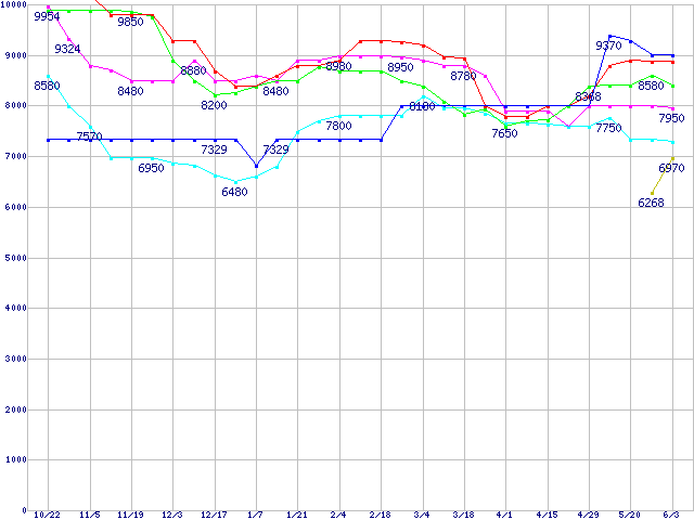 メモリ主要製品(最安値5千円~1万円未満)の最安値推移