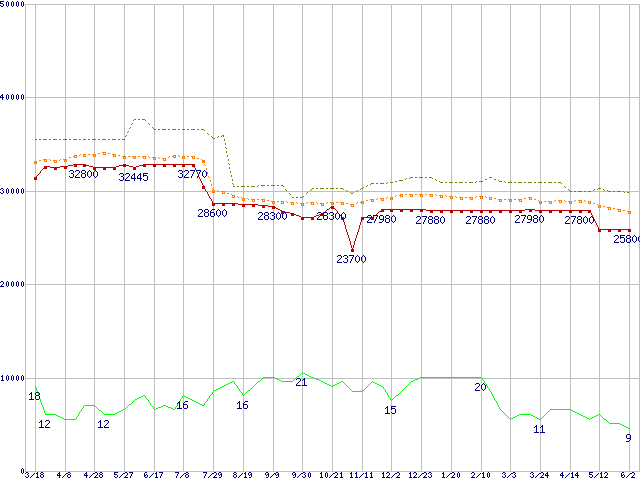 ※このグラフは過去のデータも税率5%相当に調整した税込み相当額のグラフです。 税率変更や、総額表示方式導入(2004年4月)の影響は除いています。 | | | ●凡例 | 最安値 (点線部は販売店未確認 または未調査) | 平均値 | 最高値 | ショップ数 |