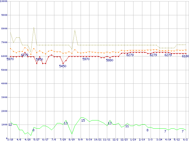※このグラフは過去のデータも税率5%相当に調整した税込み相当額のグラフです。 税率変更や、総額表示方式導入(2004年4月)の影響は除いています。 | | | ●凡例 | 最安値 (点線部は販売店未確認 または未調査) | 平均値 | 最高値 | ショップ数 |