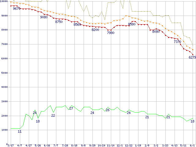| HDT722516DLAT80 (160GB,8MB)の価格推移 | | | (2005年3月17日~2006年6月1日) |