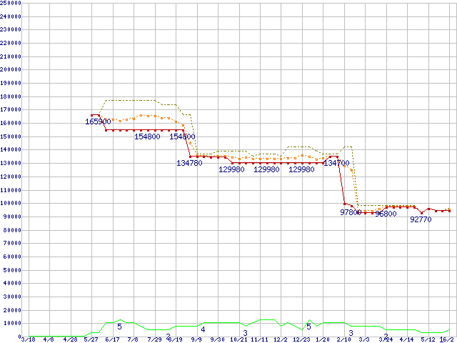 ※このグラフは過去のデータも税率5%相当に調整した税込み相当額のグラフです。 税率変更や、総額表示方式導入(2004年4月)の影響は除いています。 | | | ●凡例 | 最安値 (点線部は販売店未確認 または未調査) | 平均値 | 最高値 | ショップ数 |