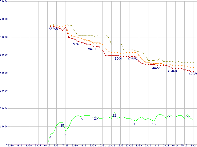 | Athlon 64 X2 4200+ (2.2GHz,L2 512KB×2,Socket 939)の価格推移 | | | (2005年3月18日~2006年6月2日) |