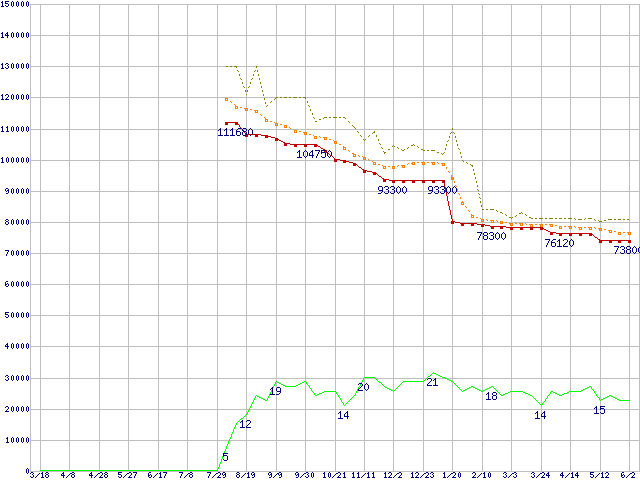 ※このグラフは過去のデータも税率5%相当に調整した税込み相当額のグラフです。 税率変更や、総額表示方式導入(2004年4月)の影響は除いています。 | | | ●凡例 | 最安値 (点線部は販売店未確認 または未調査) | 平均値 | 最高値 | ショップ数 |