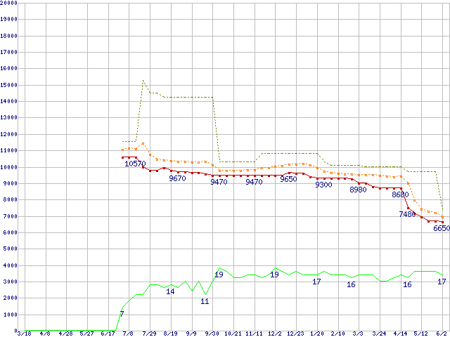 ※このグラフは過去のデータも税率5%相当に調整した税込み相当額のグラフです。 税率変更や、総額表示方式導入(2004年4月)の影響は除いています。 | | | ●凡例 | 最安値 (点線部は販売店未確認 または未調査) | 平均値 | 最高値 | ショップ数 |