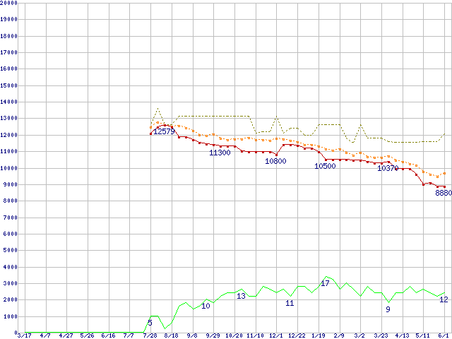 ※このグラフは過去のデータも税率5%相当に調整した税込み相当額のグラフです。 税率変更や、総額表示方式導入(2004年4月)の影響は除いています。 | | | ●凡例 | 最安値 (点線部は販売店未確認 または未調査) | 平均値 | 最高値 | ショップ数 |
