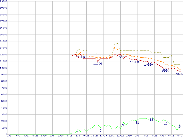 ※このグラフは過去のデータも税率5%相当に調整した税込み相当額のグラフです。 税率変更や、総額表示方式導入(2004年4月)の影響は除いています。 | | | ●凡例 | 最安値 (点線部は販売店未確認 または未調査) | 平均値 | 最高値 | ショップ数 |