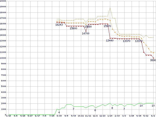 ※このグラフは過去のデータも税率5%相当に調整した税込み相当額のグラフです。 税率変更や、総額表示方式導入(2004年4月)の影響は除いています。 | | | ●凡例 | 最安値 (点線部は販売店未確認 または未調査) | 平均値 | 最高値 | ショップ数 |