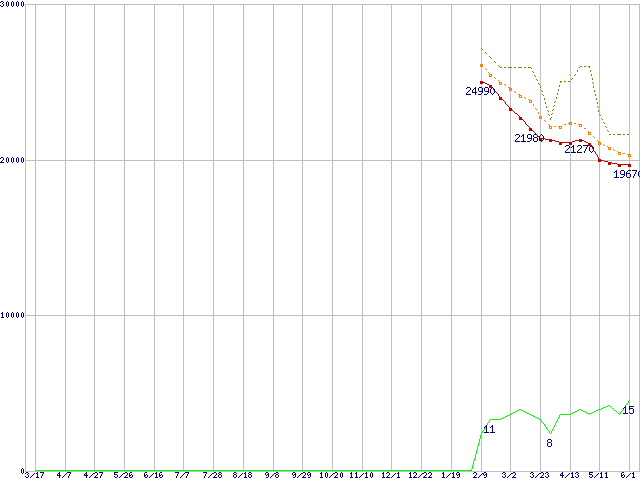 ※このグラフは過去のデータも税率5%相当に調整した税込み相当額のグラフです。 税率変更や、総額表示方式導入(2004年4月)の影響は除いています。 | | | ●凡例 | 最安値 (点線部は販売店未確認 または未調査) | 平均値 | 最高値 | ショップ数 |