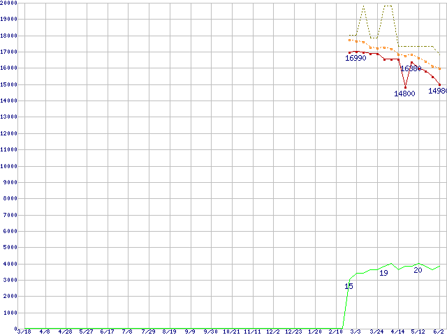 ※このグラフは過去のデータも税率5%相当に調整した税込み相当額のグラフです。 税率変更や、総額表示方式導入(2004年4月)の影響は除いています。 | | | ●凡例 | 最安値 (点線部は販売店未確認 または未調査) | 平均値 | 最高値 | ショップ数 |
